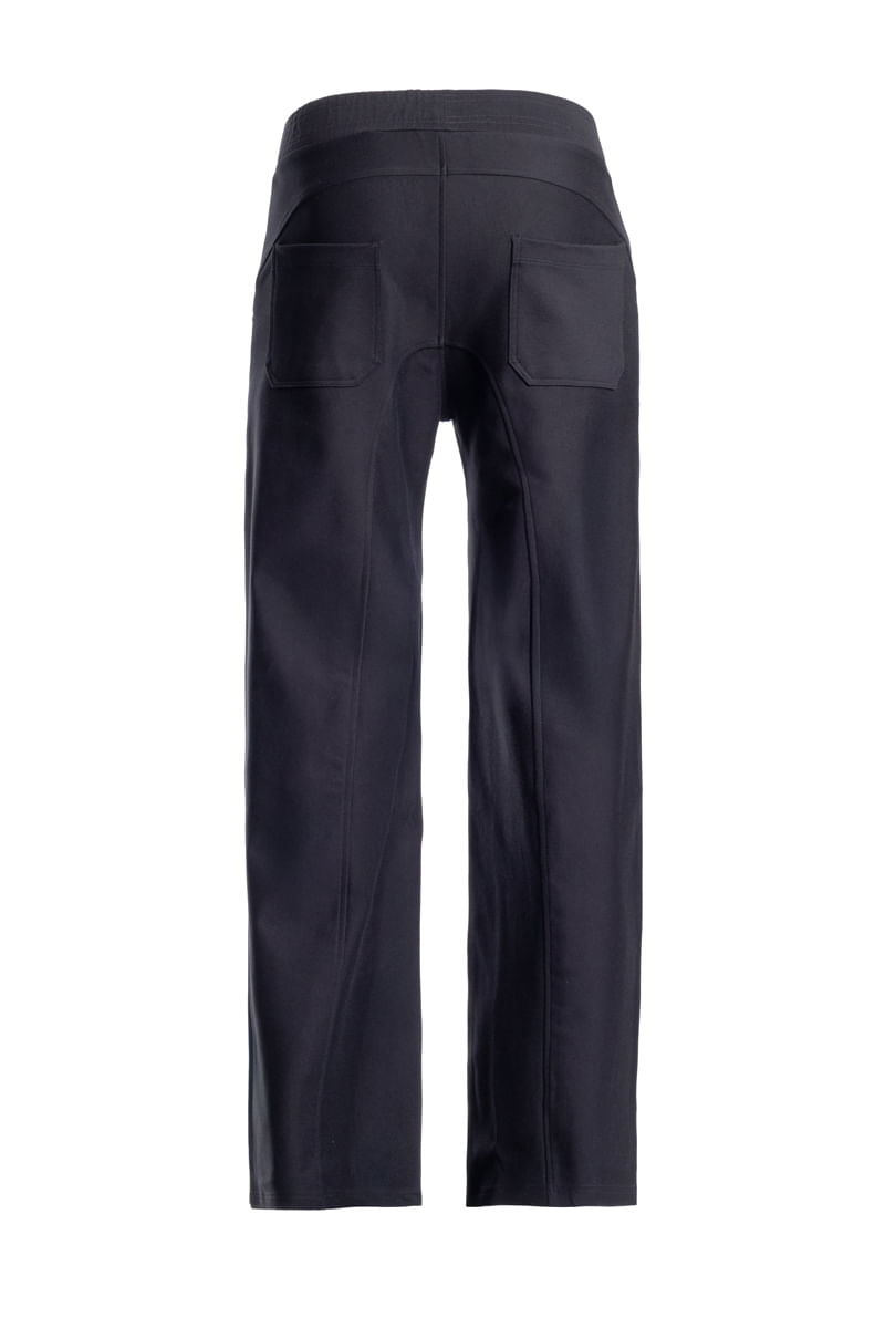 Este pantalón en algodón licrado redefine la silueta urbana con cortes audaces en la parte frontal y posterior que narran la majestuosa estructura del Reino.